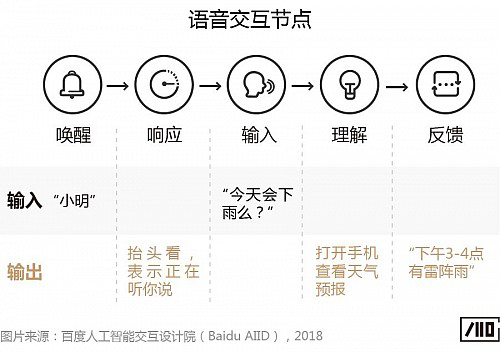 在百度AI交互設計院的研究地圖中,語音交互流程被劃分為五個環節 – 喚醒、響應、輸入、理解、反饋。其中喚醒是每一次用戶與語音產品交互的第一個接觸點,因此喚醒環節的體驗在整個語音交互流程中至關重要,它的體驗好壞將直接影響用戶對產品的“第一印象”。