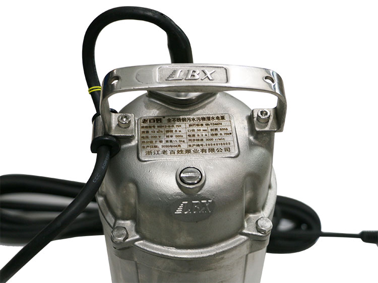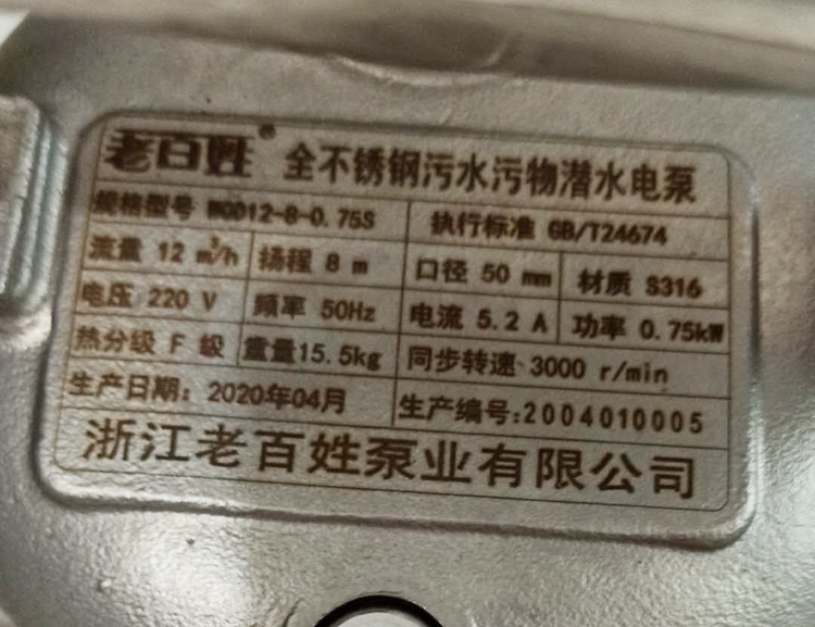老百姓不銹鋼污水污物潛水電泵WQD12-8-0.75S機身印有參數