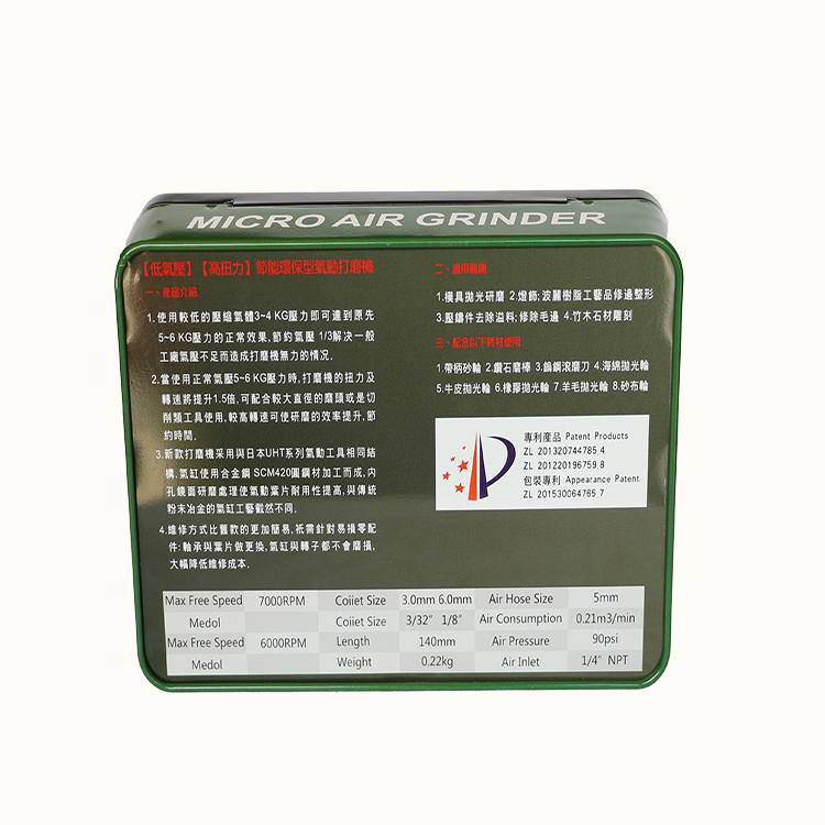 臺(tái)灣氣動(dòng)刻磨機(jī)特點(diǎn):體積小重量輕,鋁筆形,指尖能購(gòu)充分握住精密設(shè)計(jì)的葉片研磨器,安全耐久高速旋轉(zhuǎn),
