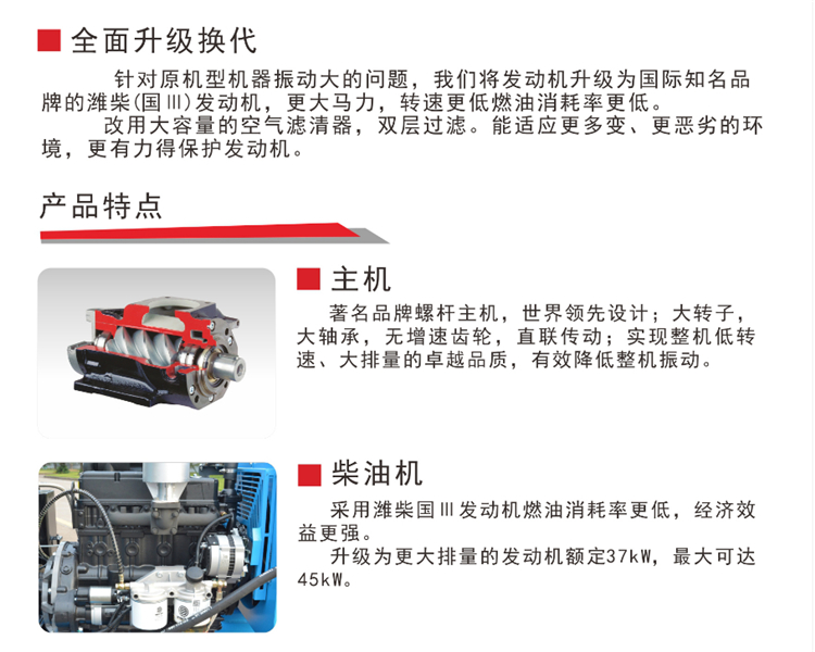 采用濰柴國(guó)Ⅲ發(fā)動(dòng)機(jī)燃油消耗率更低,經(jīng)濟(jì)效益更強(qiáng)升級(jí)為更大排量的發(fā)動(dòng)機(jī)額定37kW,最大可達(dá)45kW。