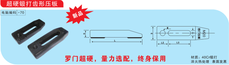 超硬鍛打齒形壓板材質(zhì)40cr,鍛打,淬火熱處理,表面發(fā)黑。
