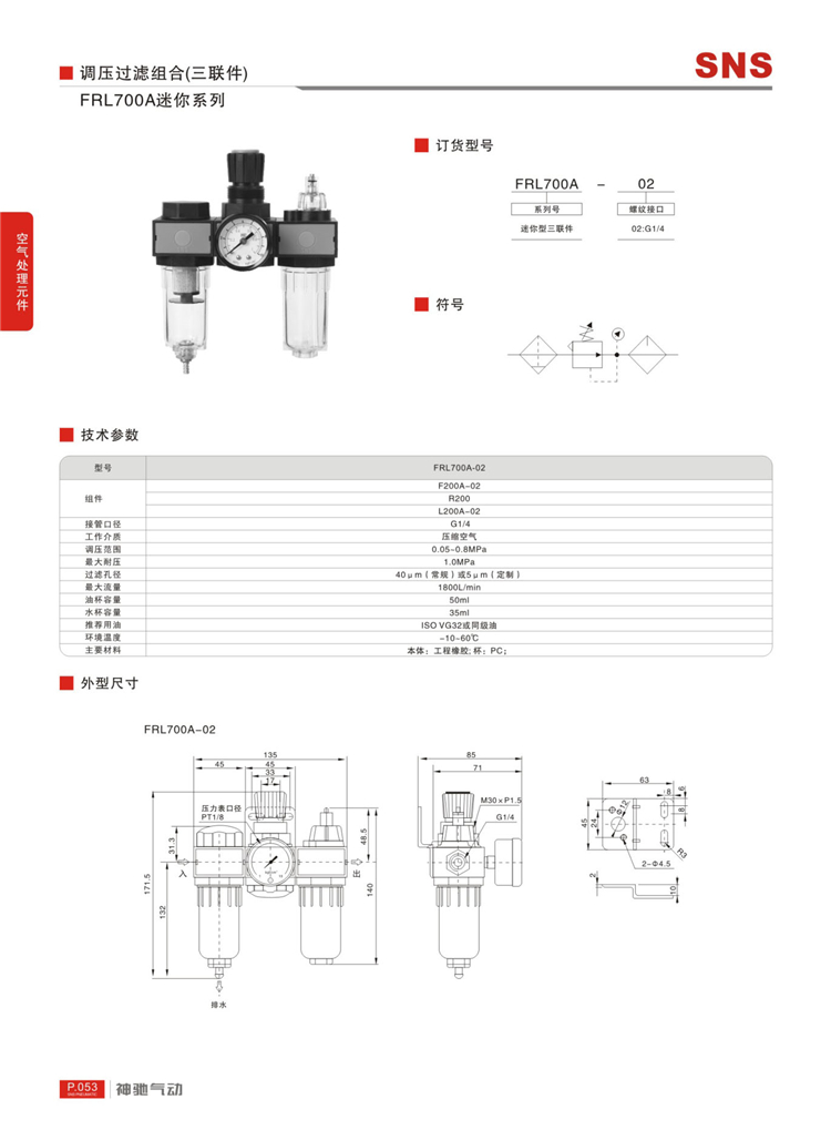 神馳氣動FRL700A迷你系列調壓過濾組合(三聯件)技術參數