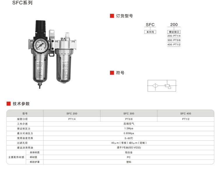 神馳氣動SFC調壓過濾器組合二聯件主要參數