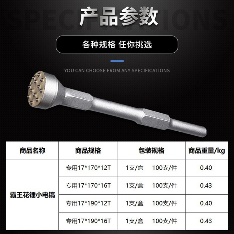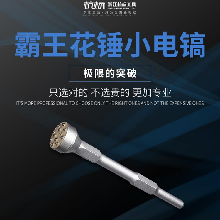 霸王花錘小電鎬鑿子采用優質40鉻鋼,整體熱處理,質地堅硬耐磨,穩固防滑,提高工作效率。