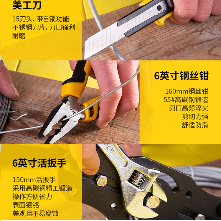 維修組套美工刀、6英寸鋼絲鉗、6英寸活扳手