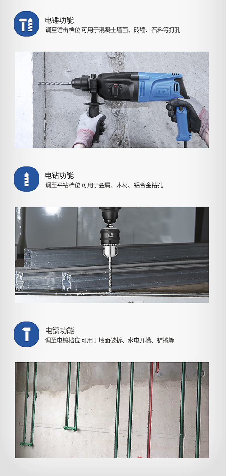 可搭配不同型號鉆頭,完成多項鉆孔工作