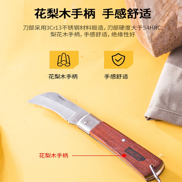 得力工具直嘴電工刀彎嘴電工刀木柄絕緣電線刀剝皮刀不銹鋼折疊刀