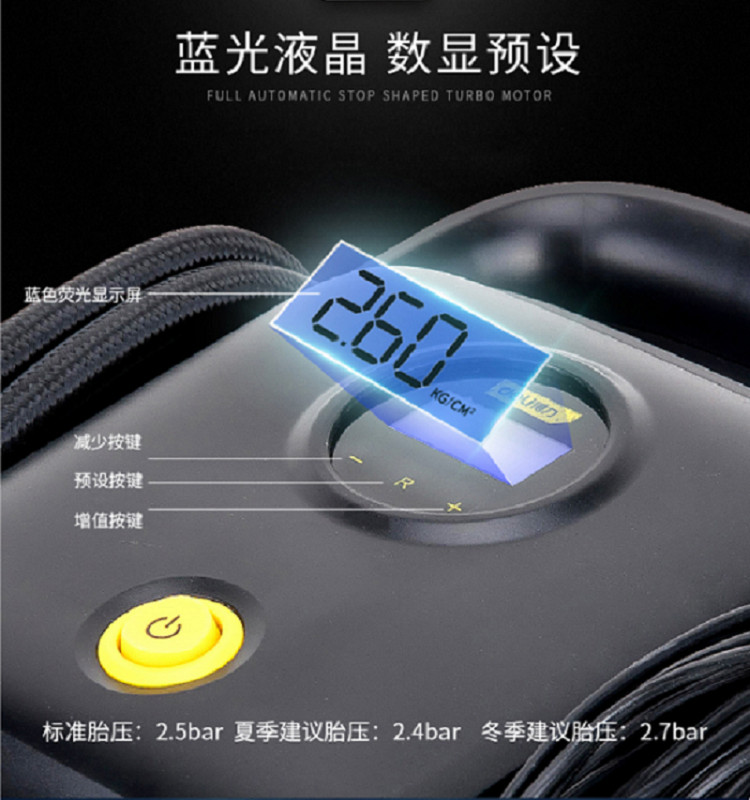 數顯充氣泵只需按“+”“-”鍵設定好胎壓值 充滿自動停