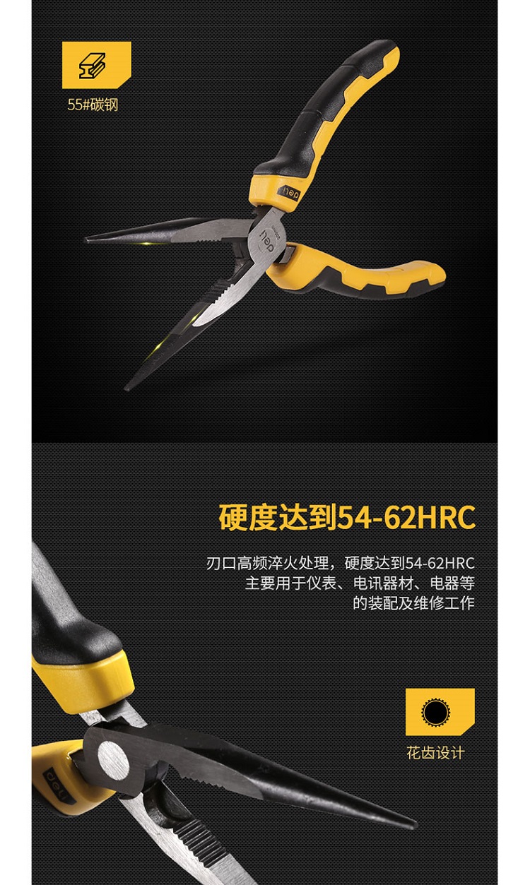 6/8寸家用尖嘴鉗刃口高頻淬火,硬度達(dá)到54-62HRC,剪切力強(qiáng)