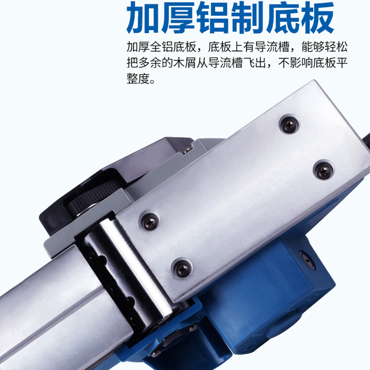 東成電刨M1B-FF-110X2電刨子木工電動工具,加厚全鋁底板,底板上有導流槽,能夠輕松把多余的木屑從導流槽飛出,不影響底板平整度。