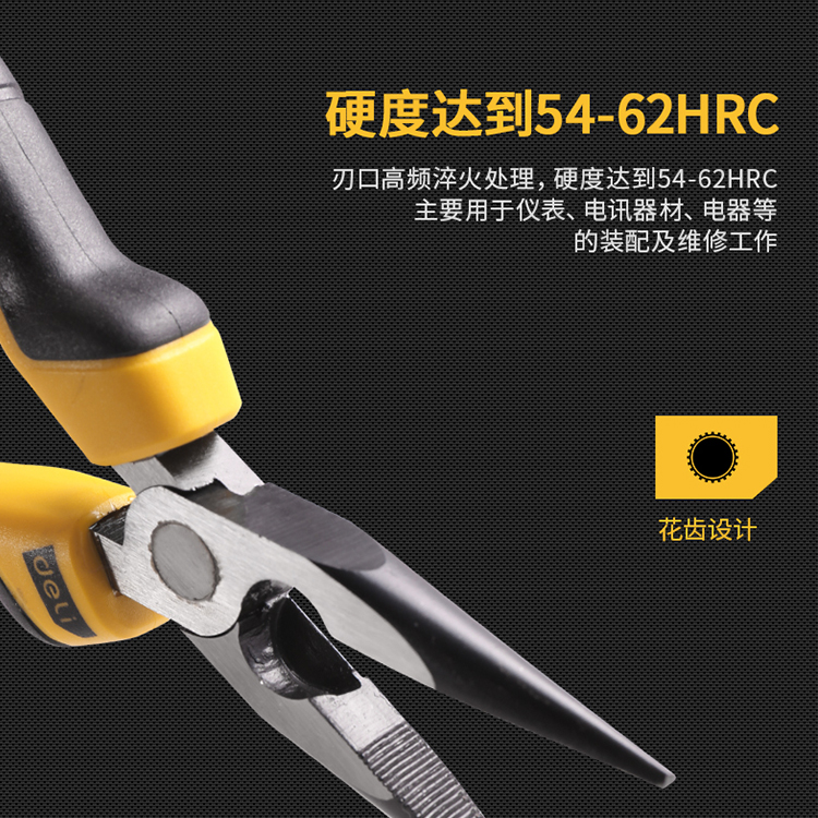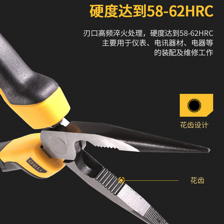 尖嘴鉗刃口高頻淬火,硬度達(dá)到58-62HRC,剪切力強(qiáng)