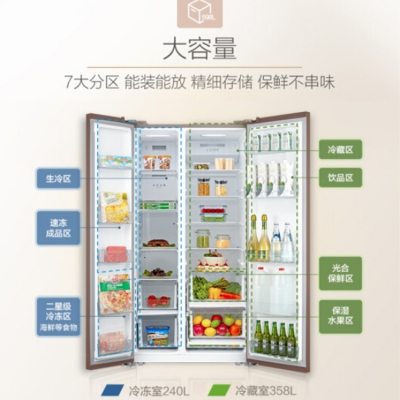 美的對開門雙門家用冰箱大容量,分區存儲,可滿足兩周需求。