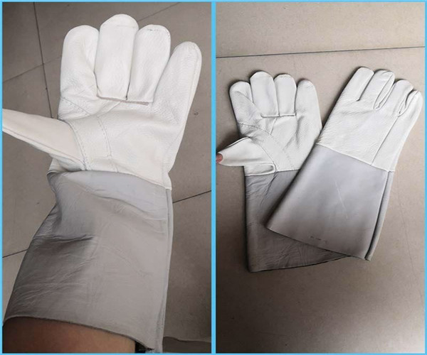 牛盾頭層牛皮全皮長電焊手套淺色產品展示