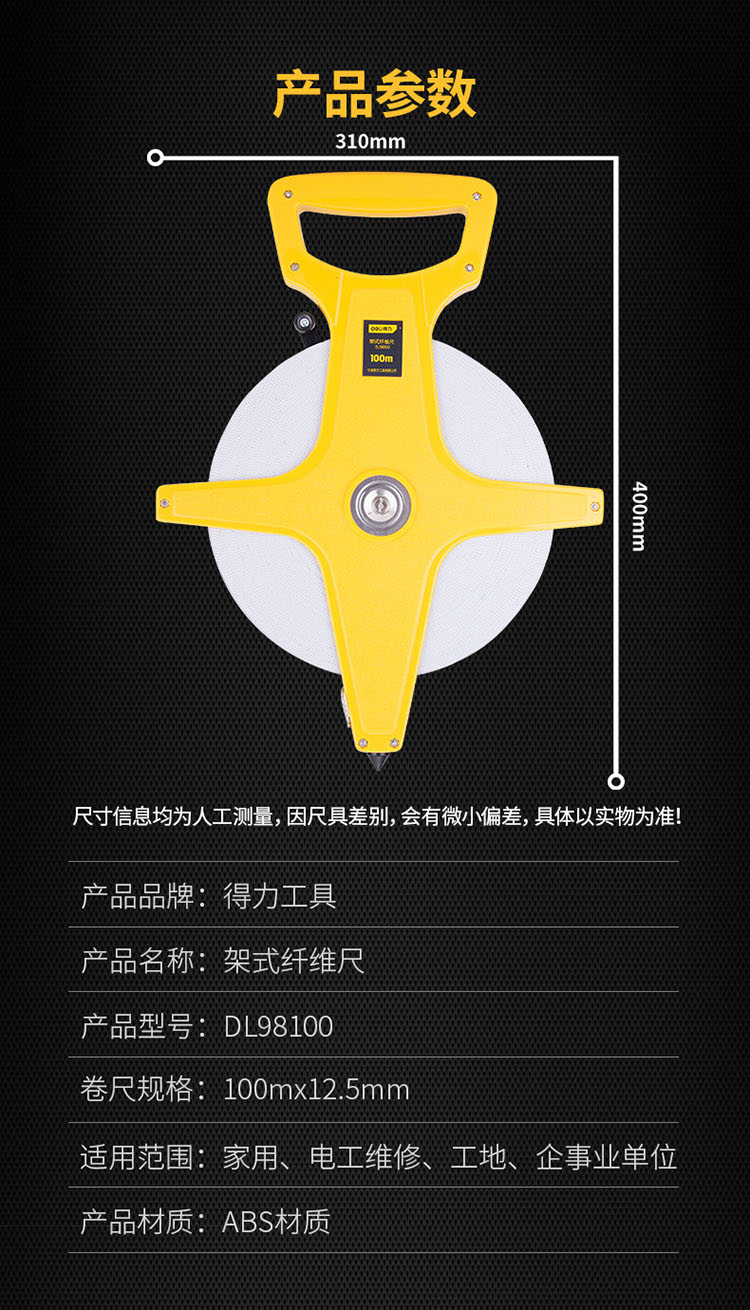 得力工具工程軟尺架式纖維長尺長卷尺100米測量皮卷尺手提尺 米尺