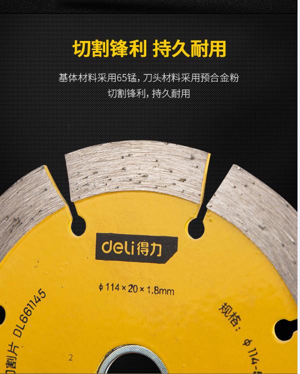 得力金剛石切割鋸片產(chǎn)品采用先進的加工工藝,熱壓式燒結(jié),刀頭接合緊密,強度高。