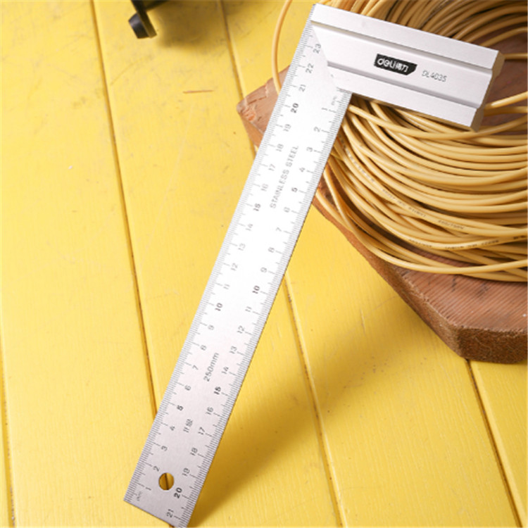 得力鋼角尺250mm尺身雙刻度設計,鋁型材底座。