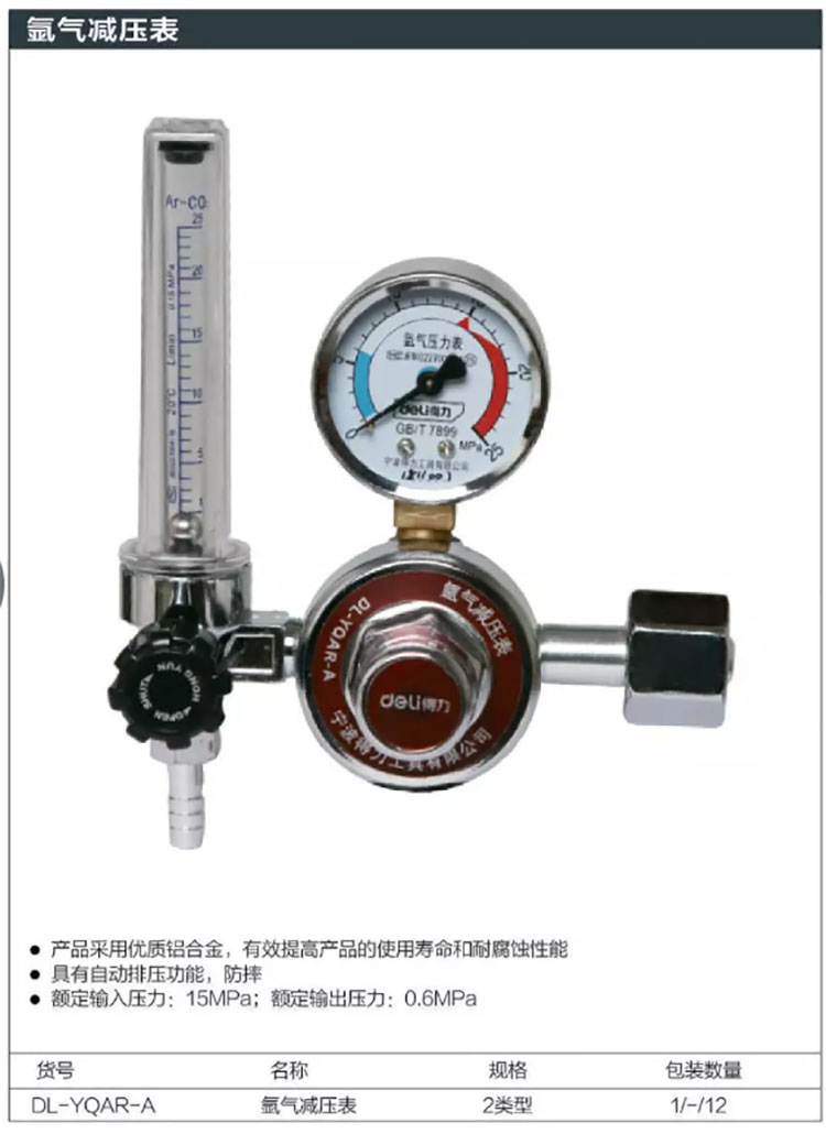 得力工具氬氣減壓表DL-YQAR-A A型氬氣減壓表焊割工具