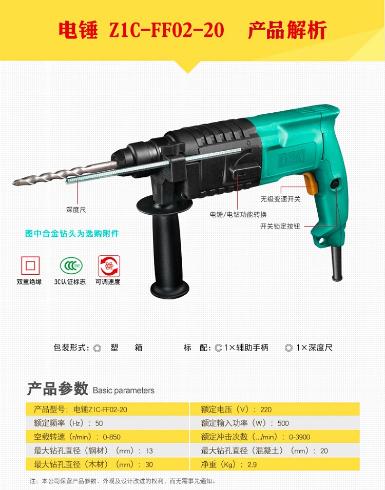 電錘電鉆二功能,輕型電錘 500W功率無級變速開關
