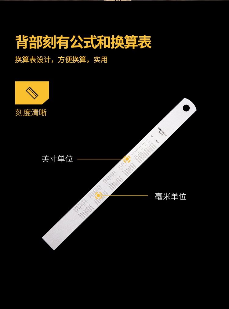 鋼直尺背部刻有公式和換算表,方便、實用