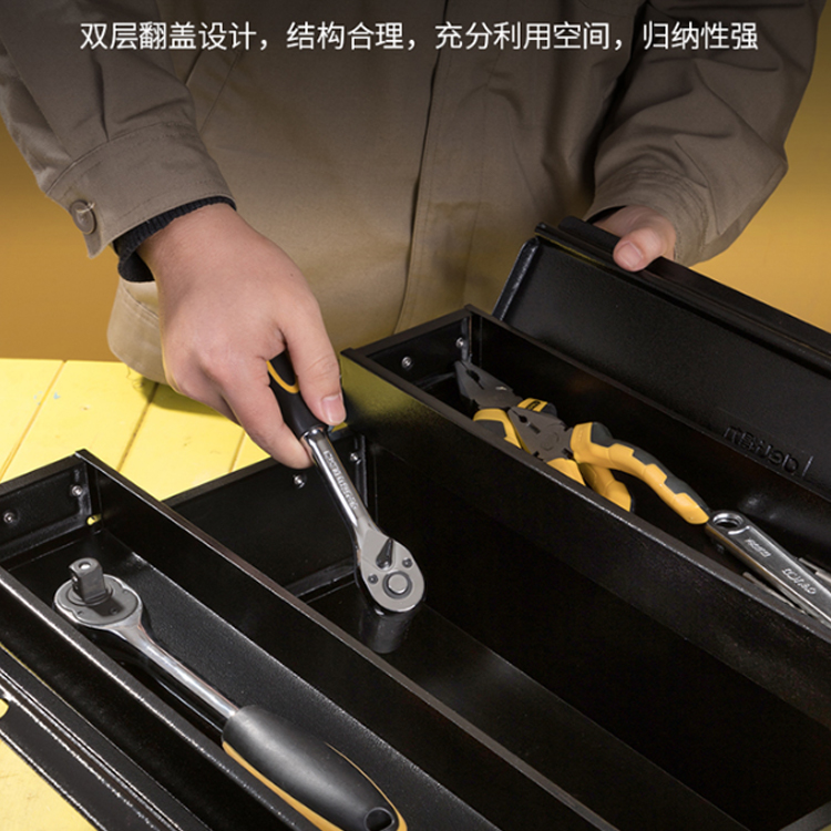 得力(deli) 加厚型金屬工具箱雙層翻蓋設計,充分利用空間。