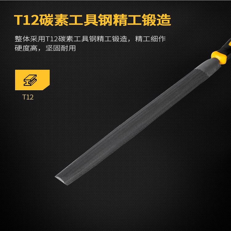 中齒半圓銼產品銼身采用T12工具鋼,銼齒表面特殊熱處理涂層,經久耐用。