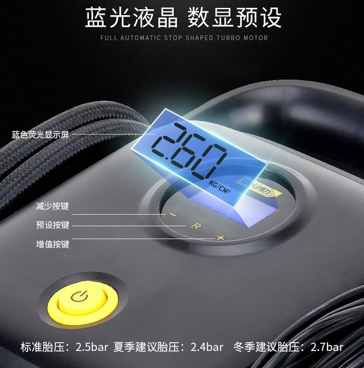 便攜式打氣筒藍(lán)光顯示屏,具有數(shù)顯預(yù)設(shè)功能