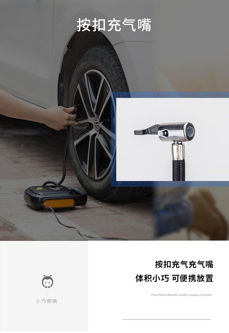車載充氣泵采用按扣充氣嘴,體積小巧,可便攜放置