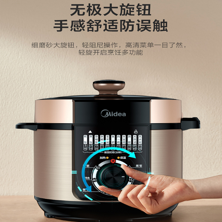 美的家用智能電高壓鍋細磨砂大旋鈕,輕松開啟烹飪多功能。