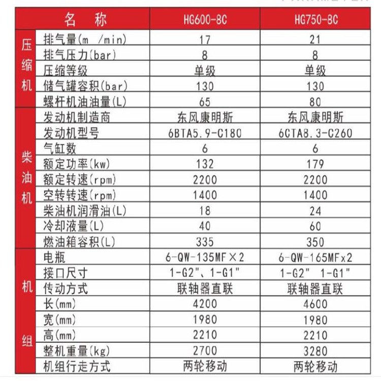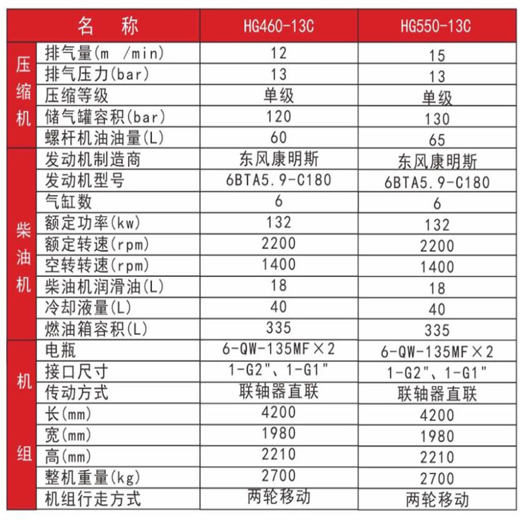 紅五環(huán)柴驅-HG系列中低壓移動空壓機,HG460、HG550參數表
