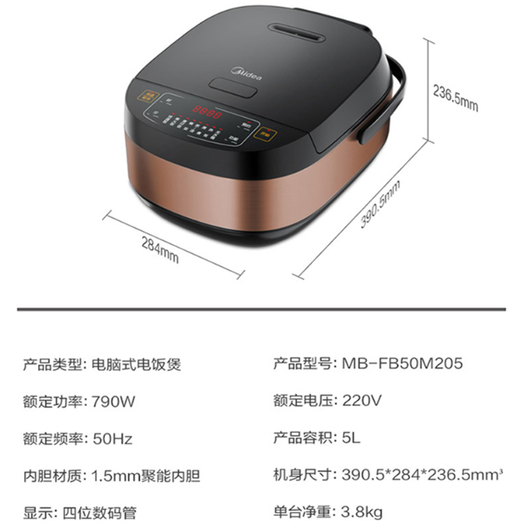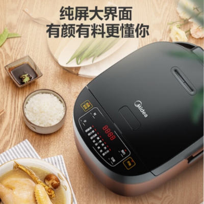美的家用電飯煲頂置耀石黑大純屏,配合金屬拉絲機身外觀。