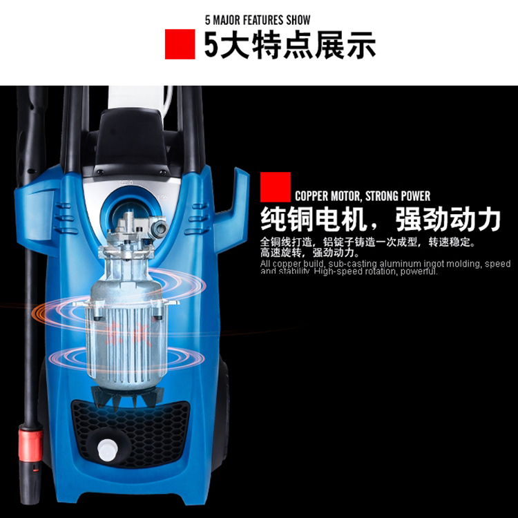 高壓清洗機(jī)5大特點(diǎn),純銅電機(jī),強(qiáng)勁動(dòng)力全銅線打造,鋁錠