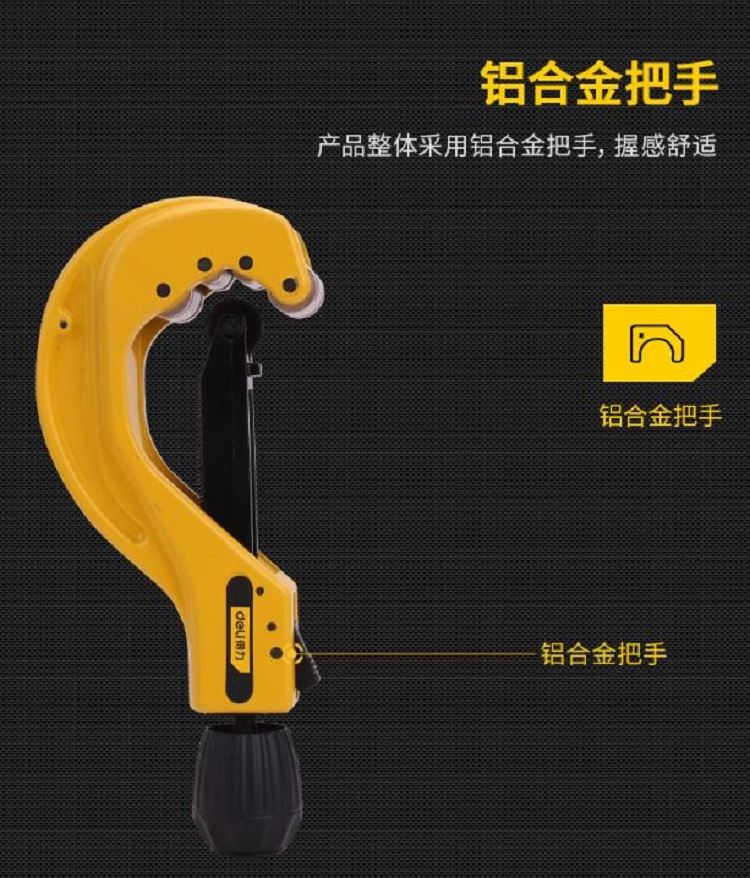 得力金屬管子割刀產品殼體采用鋁合金,直槽、旋球采用鋅合金,整體美觀,實用