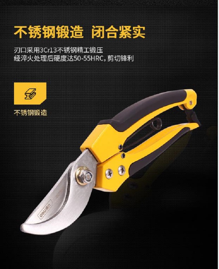得力彎嘴花木剪產(chǎn)品刃口采用不銹鋼精工鍛壓,經(jīng)淬火處理后硬度達(dá)50-55HRC,剪切鋒利