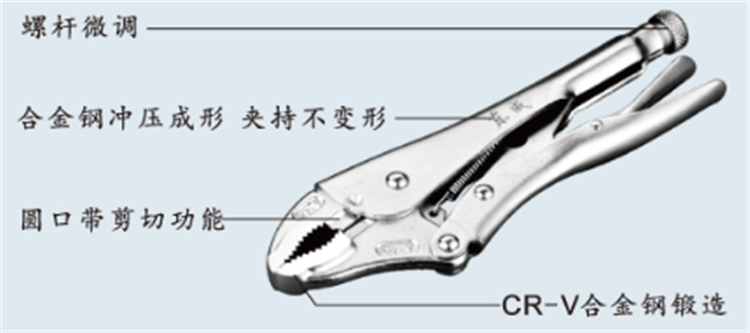 并產生很大的夾緊力,使被夾緊零件不會松脫,而且鉗口有很多檔調節位置,供夾緊