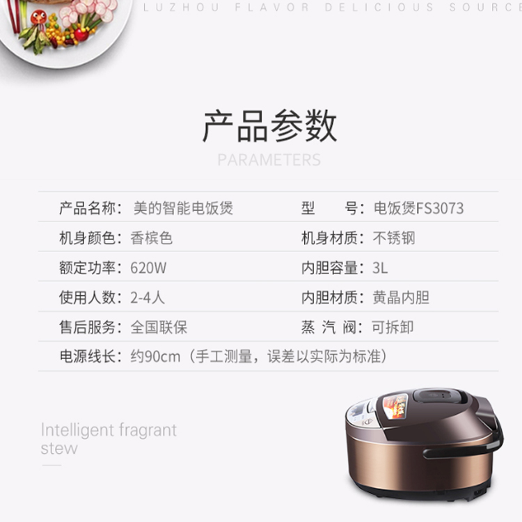 美的(Midea)電飯煲電飯鍋3L智能釜內(nèi)膽家用電飯煲MB-FS3073
