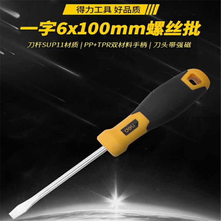 得力 一字螺絲刀批刀桿為鉻釩鋼整體淬火而成,硬度高,韌性好,批頭帶強(qiáng)磁 。