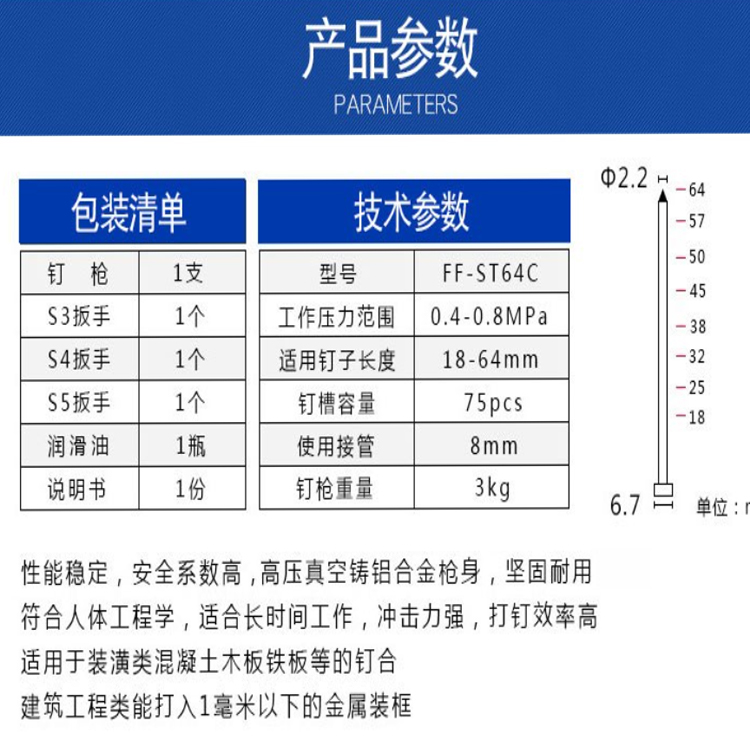 東成氣動鋼釘槍FF-ST64C堅固耐用高強度機身