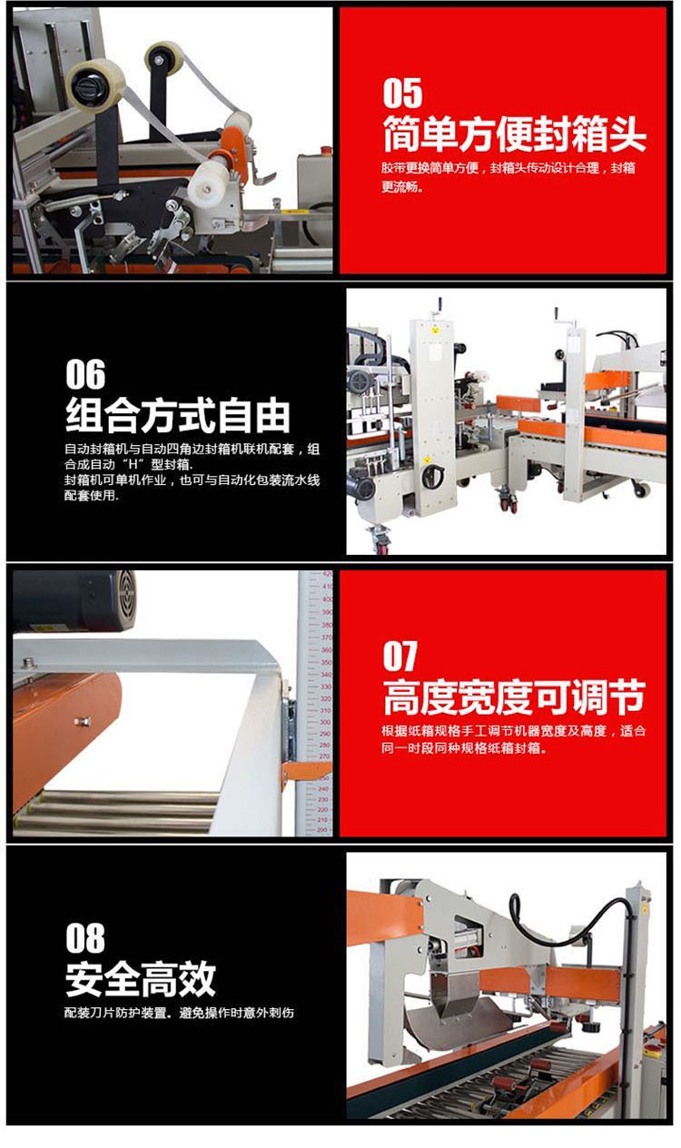5、該封箱機可單機作業,也可與自動化包裝流水線配套使用。