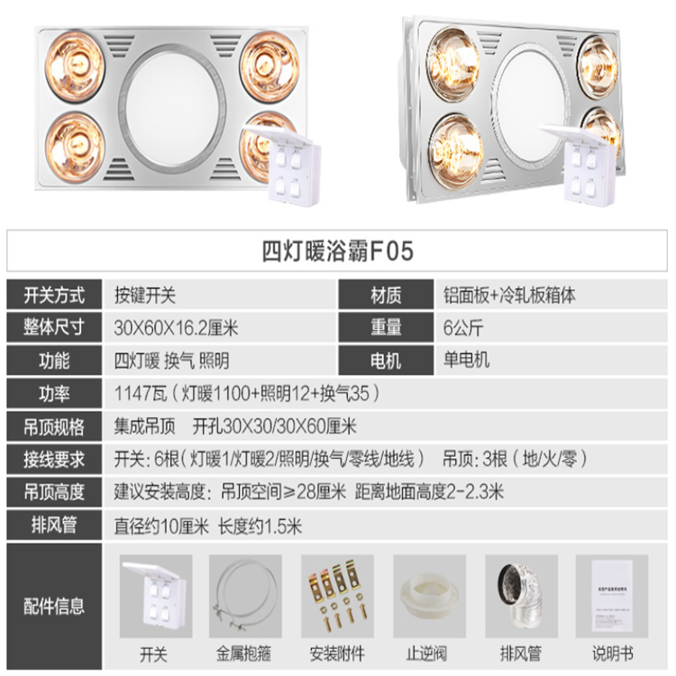 集成吊頂四燈暖浴霸 取暖換氣LED照明三合一 F05