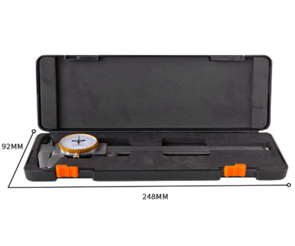 得力150mm表盤式游標卡尺測量尺包裝及尺寸展示圖
