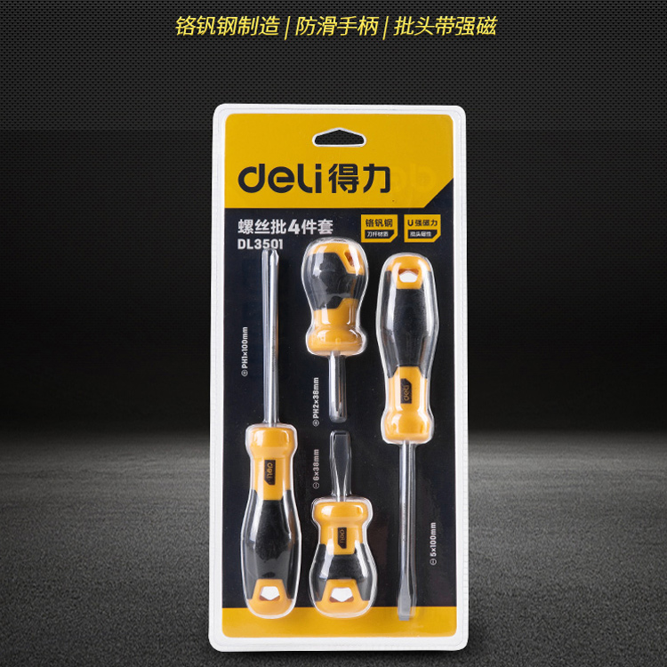 得力工具螺絲批4件套刀桿鉻釩鋼材質刀頭帶磁性螺絲批套裝DL3501