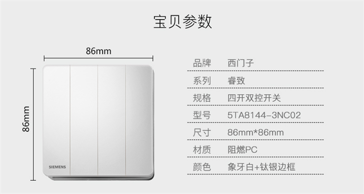 西門子 開關插座面板睿致鈦銀邊四開雙控86型