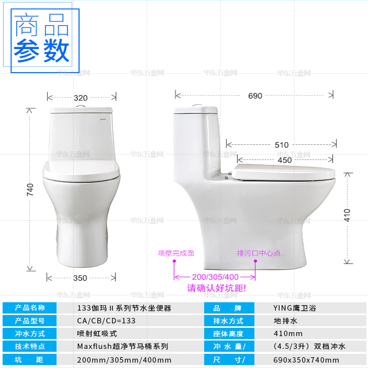 鷹牌133坐便器商品參數圖,雙檔沖水