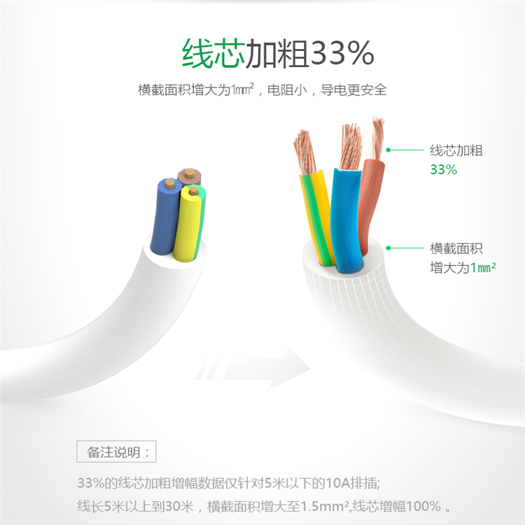 公牛基礎(chǔ)插線板GN-102線芯加粗,橫截面增大,阻力小,導(dǎo)電更安全。