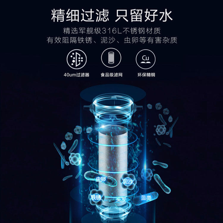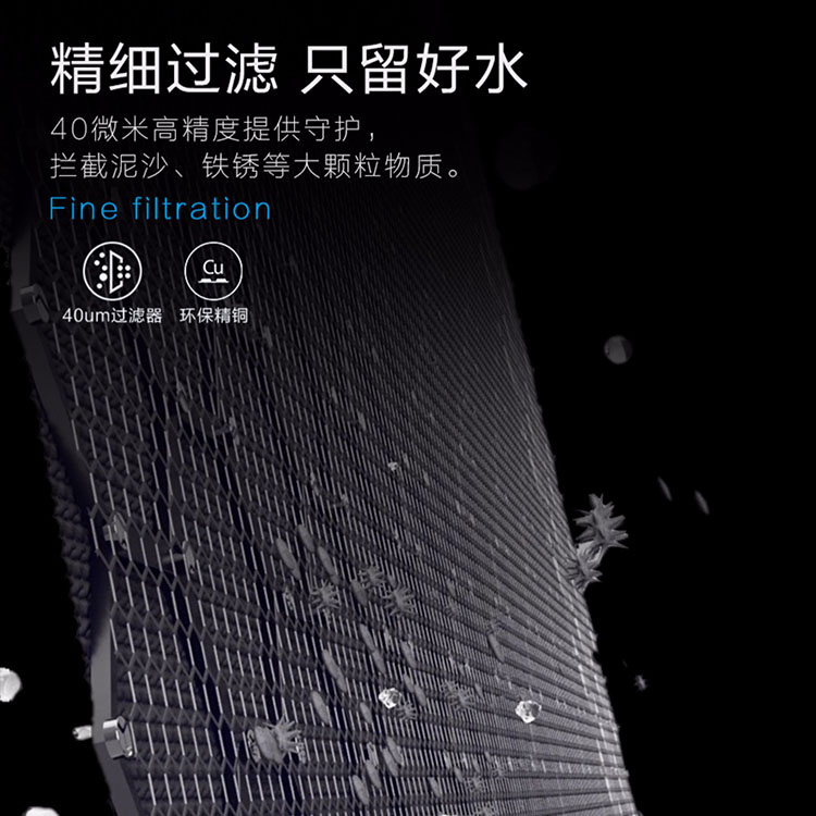 精細(xì)過(guò)濾只留好水,40微米高精度提供守護(hù),攔截泥沙,鐵銹等大顆粒物質(zhì)。