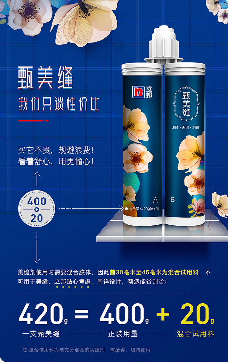 立邦美縫劑瓷磚地磚專用家用防水美縫勾縫填縫施工工具劑膠甄美縫:AB組膠組成粘度差異越小,混合愈加均勻,上磚呈現的效果才會更好!立邦雙組膠體粘度統一,施工方便,帶給您舒適的產品體驗。