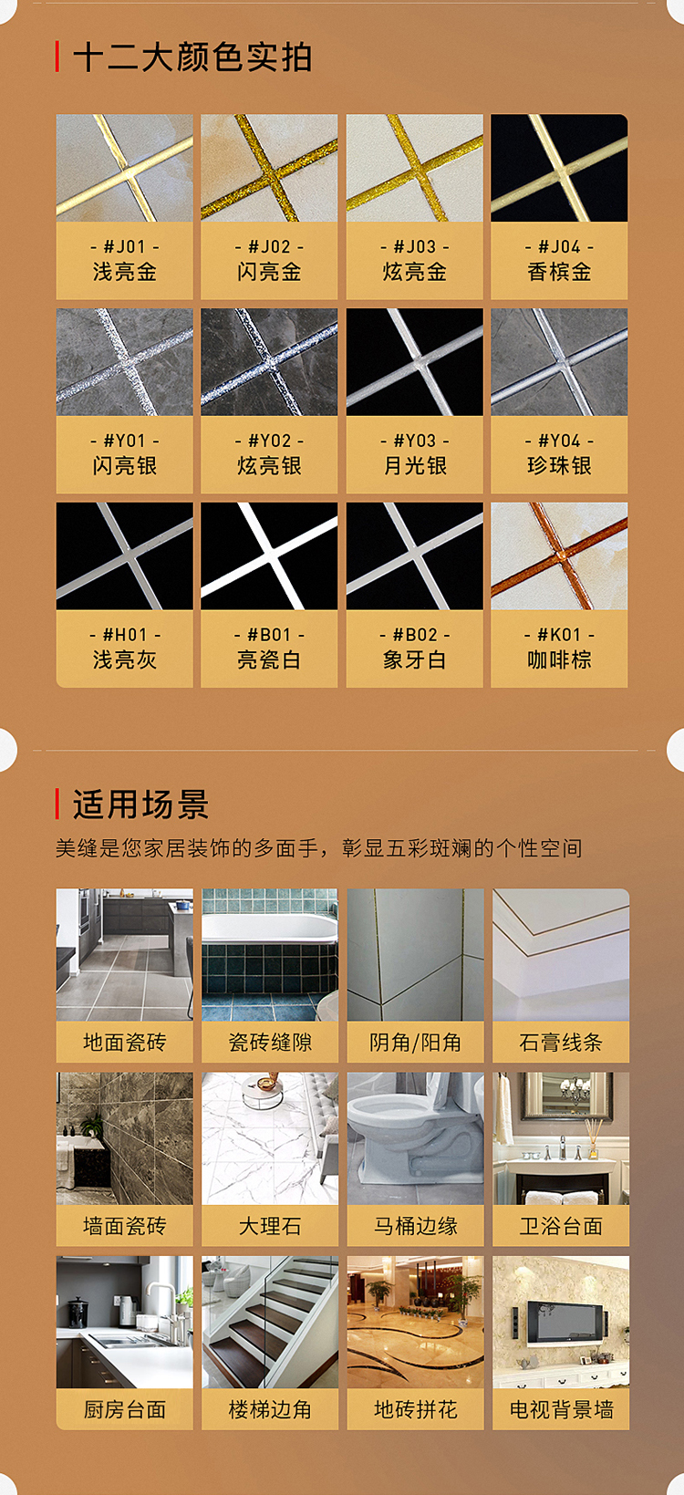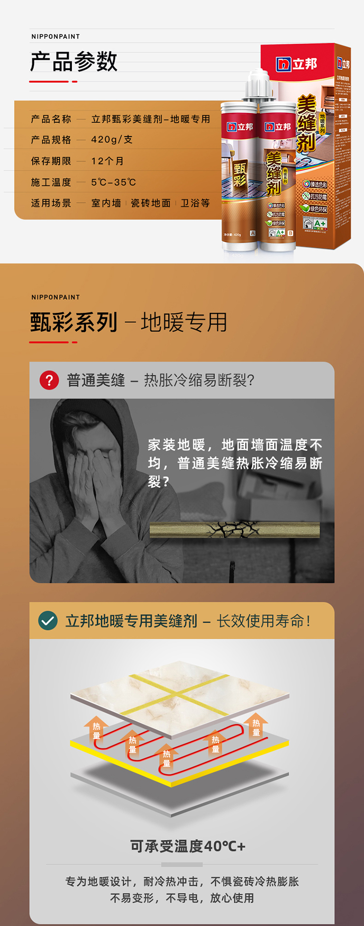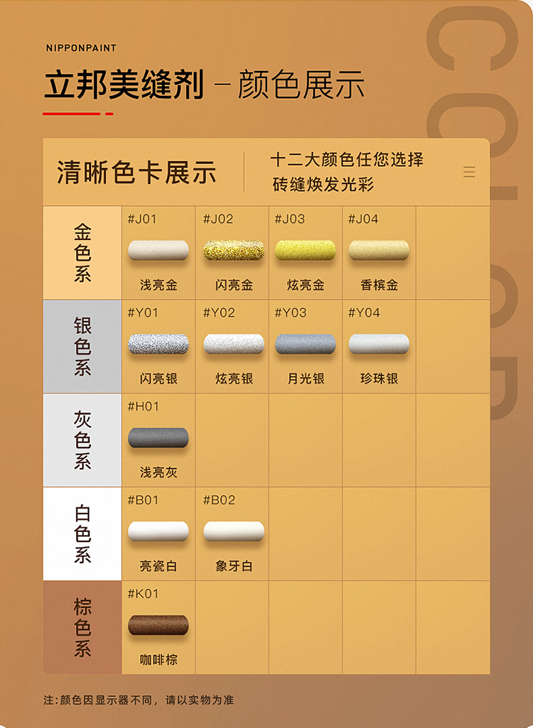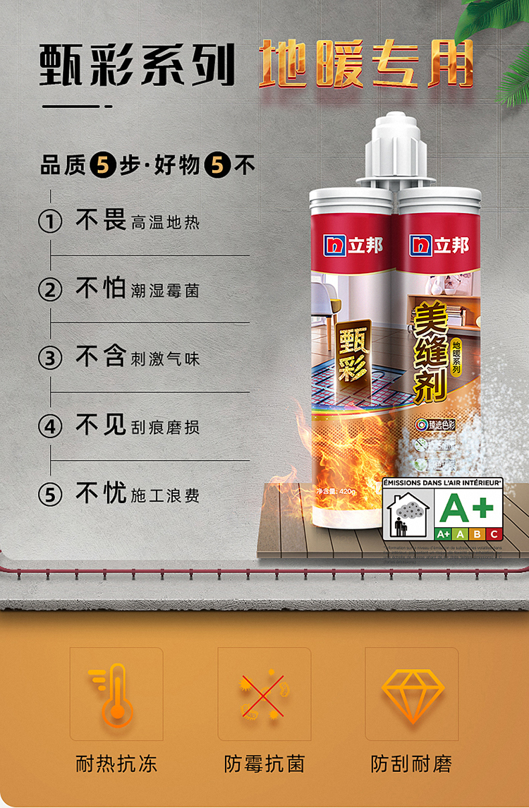 立邦地暖縫美縫劑瓷磚地磚專用美瓷膠美縫膠填縫:抗劃抗滲,精選進口高密度環氧樹脂原料,擺平劃痕,污漬不易滲透。持久煥發光亮色彩。
