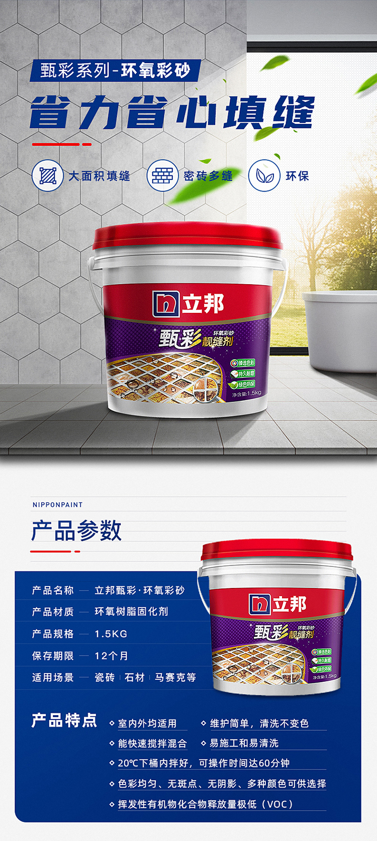 立邦環氧彩砂水性美縫劑:環保低味,采用立邦凈味技術,使用高成本環保原料,