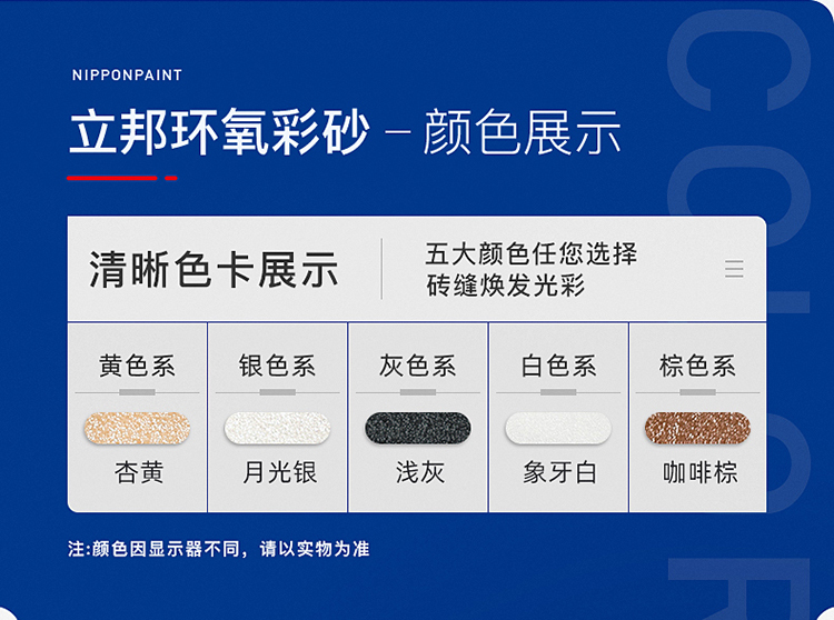 立邦環氧彩砂水性美縫劑:色彩均勻、無斑點、無陰影、多種顏色可供選擇。