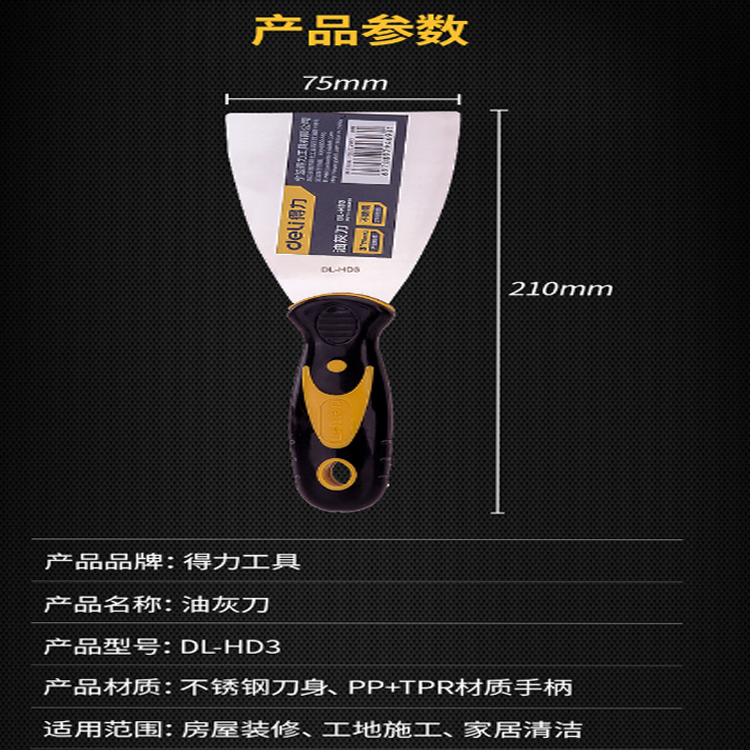 得力(deli) 不銹鋼油灰刀手柄采用PP+TPR材質(zhì)制作,手感舒適,防滑耐刮